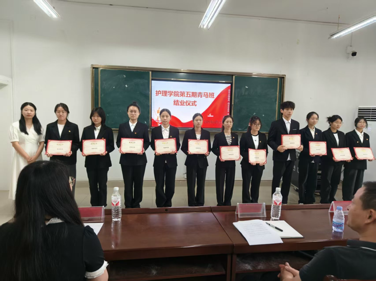仪式在庄严的国歌声中拉开帷幕。优秀学员代表白娅楠同学上台,分享在青马班学习期间对马克思主义理论的深入理解、实践能力的提升以及团队协作的感悟,用亲身经历传递成长力量。随后,王婧祎老师在发言中回顾了青马班的发展历程,肯定了学员们在理论学习、实践锻炼等方面的成长。紧接着主持人宣读了优秀学员、优秀班干表彰决定,各位领导为获奖学员颁发荣誉证书,在结业证书颁发环节,领导与老师逐一为学员颁发证书并合影,记录下这一意义非凡的时刻。最后护理学院党总支副书记朱胜利老师进行了总结讲话,鼓励他们以“青马人”的使命担当,将个人理想融入国家发展大局。